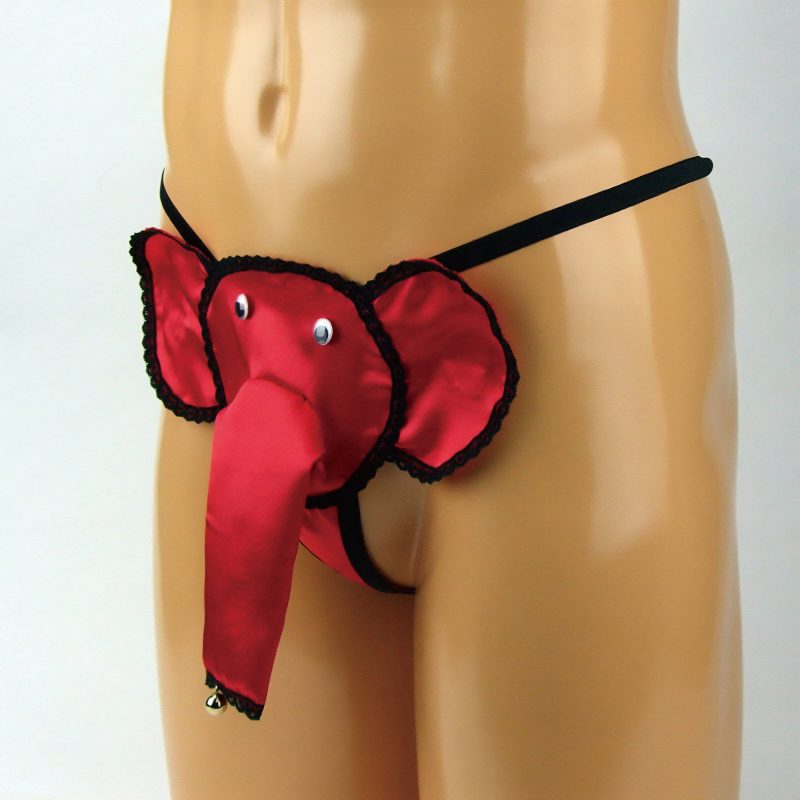 縁に黒レース加工を施したレッドカラーの鈴付きゾウさんGスト。インパクトのあるゾウさんデザインに光沢が加わることでより目立ち度アップ!ストリングタイプのゾウさんパンツです。日本製、Mサイズ