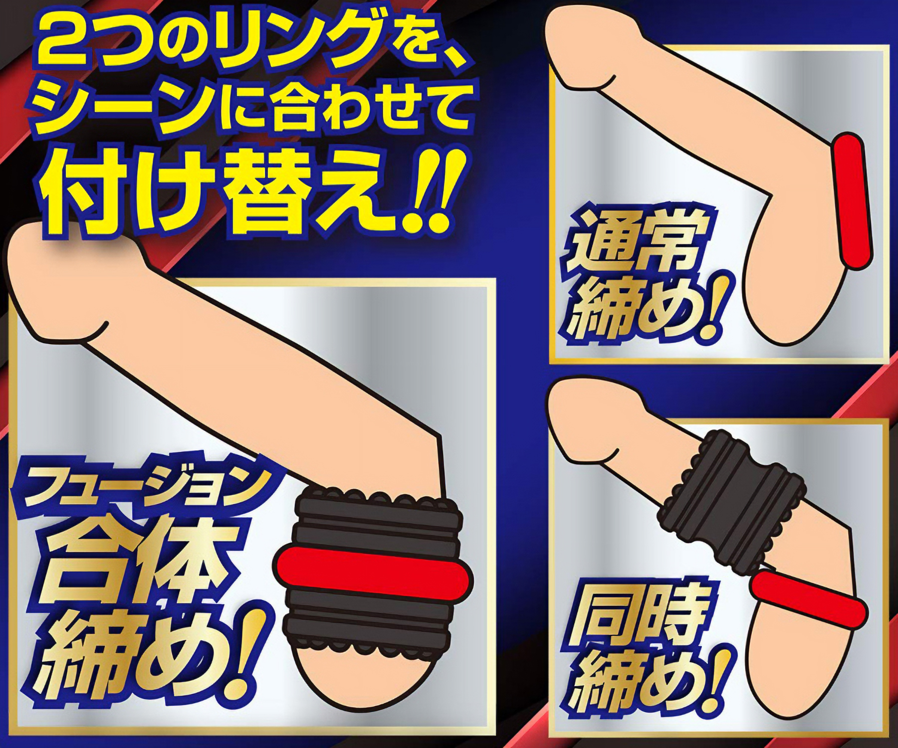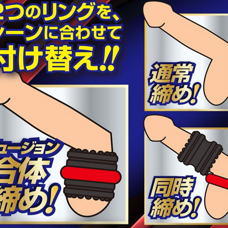 シリコン×エラストマーが合体(フュージョン)!締め付け感が超アップ!2種類のリングをシーンに合わせて自由に付け替え!それぞれ単体でも効果抜群!合体させれば潜在能力をフルで発揮!玉や竿を強力に締め付け、勃起力・射精力・持久力をUP!!攻守ともにスキのないパワー漲るZ級のアイテムをお届けします。