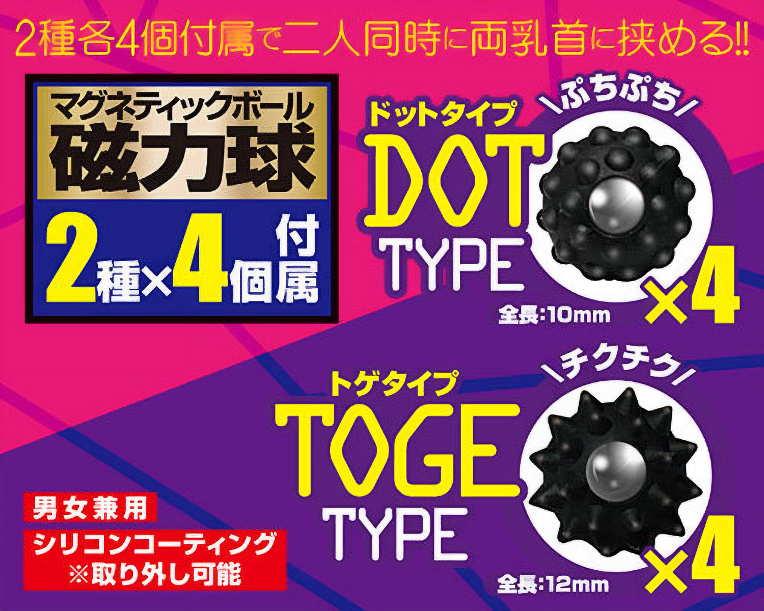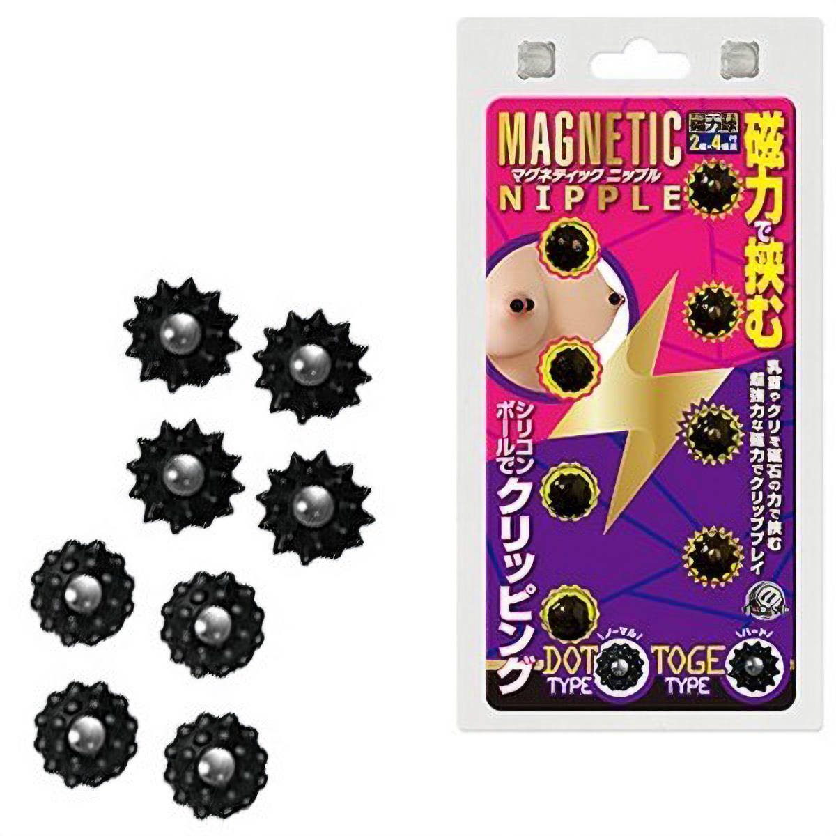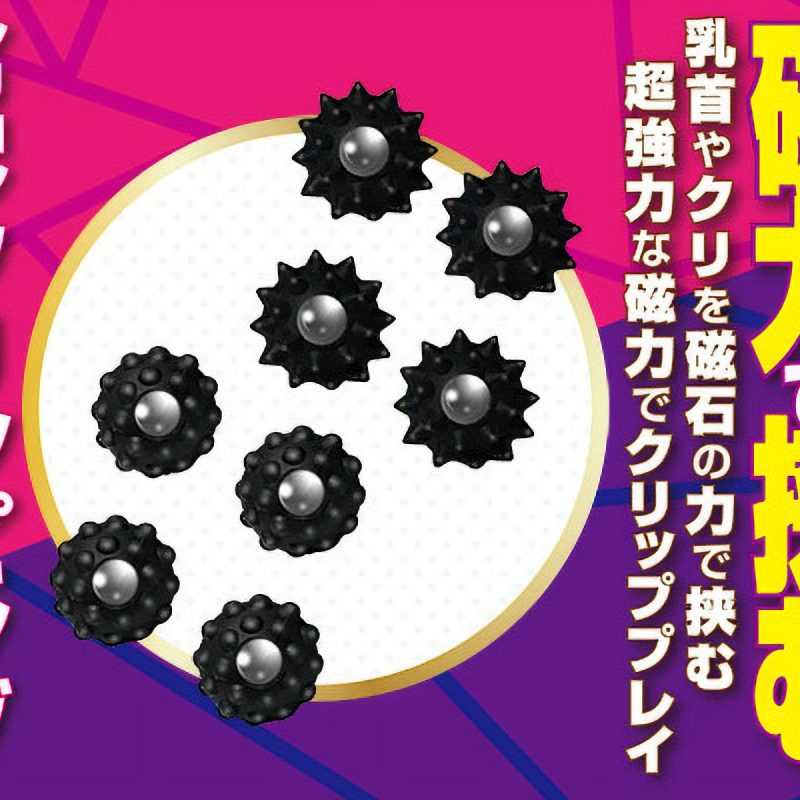マグネットの強力な磁力で敏感な部分を挟みこむ男女兼用のニップルグッズ2種セット。ボディピアスのように穴は開けず、超強力な磁力を使って乳首やクリをクリップ刺激!素材は肌に優しいシリコン製で傷つけにくい♪無数の球体が付いた全長10mmのドットタイプ4個、まきびしのようにトゲトゲとした全長12mmのトゲタイプ4個付属