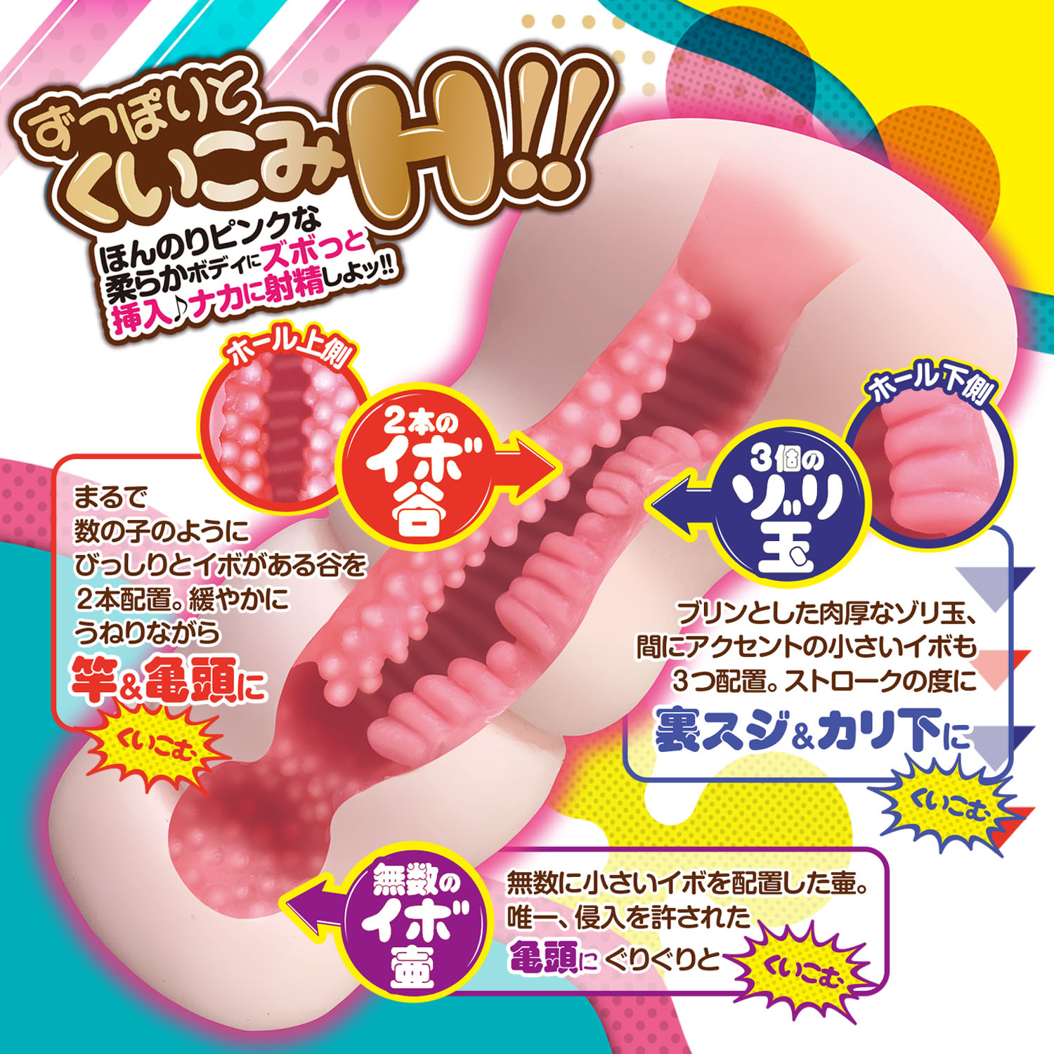 海で出会ったエロカワイイ女子とくいこみ密着H!竿全体にくいこむ上下刺激のサンドイッチを汗だくになって楽しもう!ほんのりピンクな柔らかボディにズボっと挿入!思いっきりナカに射精しちゃおう♪【内部形状】イボ谷ゾーン…竿と亀頭にくいこむ!イボがびっしりの2本のイボ谷の間を突き進め!ゾリ玉ゾーン…ブリンとした肉厚なゾリ玉が裏スジ&カリ下にくいこむ!無数のイボ壺ゾーン…亀頭だけの侵入エリア!小さいイボが亀頭にグリグリとくいこむ!・非貫通・ミニローション付属