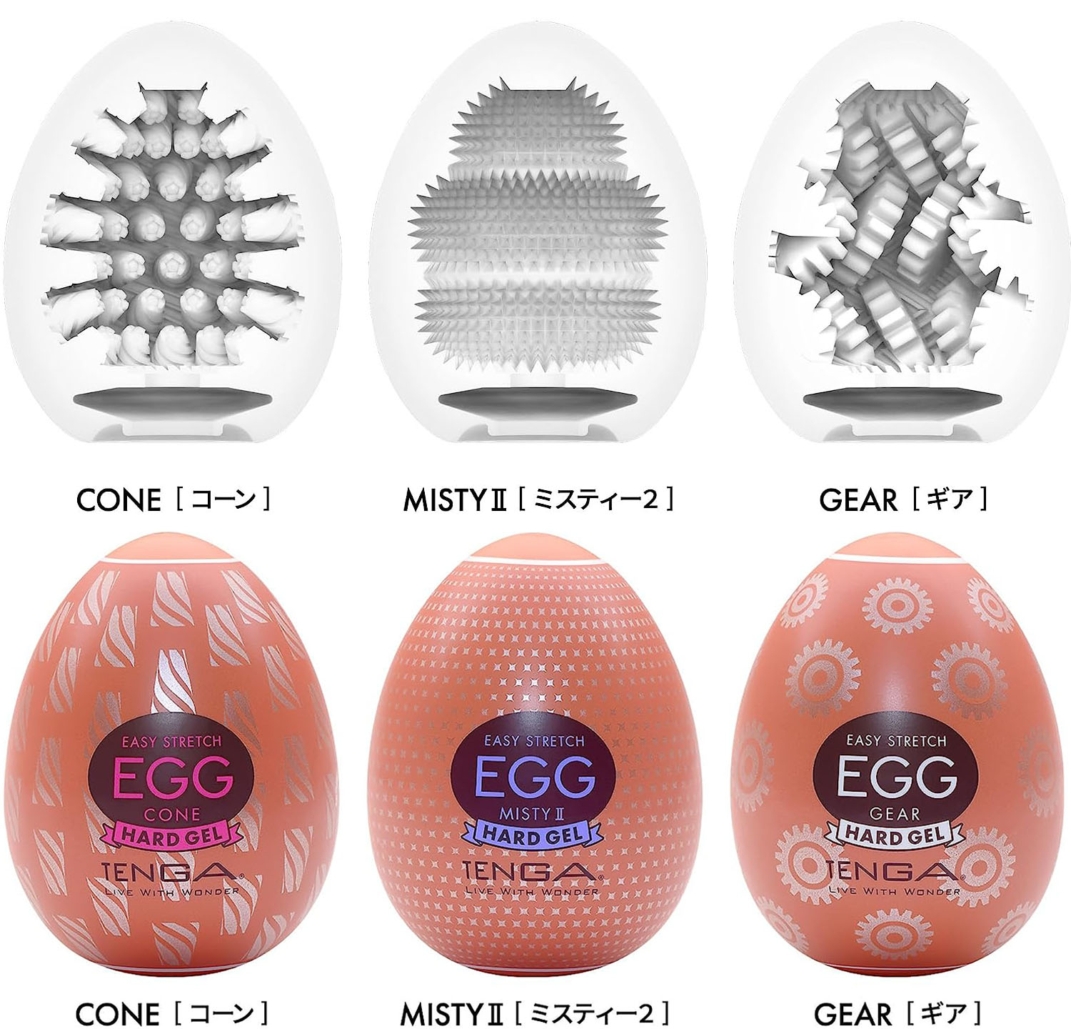 TENGA EGG HARD GEL SET Ⅱ(テンガ エッグ ハードゲル セット 2)。高弾力ゲルを採用した3種類のEGGがセットになった、アソートパックが登場!ハードな快感がお好みの方にオススメの、お試しセットです。<セット内容>TENGA EGG CONE(テンガ エッグ コーン)ねじれ突起の密集ブルブル刺激!TENGA EGG MISTY II(テンガ エッグ ミスティ2)微細突起のもっちりツブツブ刺激!TENGA EGG GEAR(テンガ エッグ ギア)歯車リブのギザギザエッジ刺激!